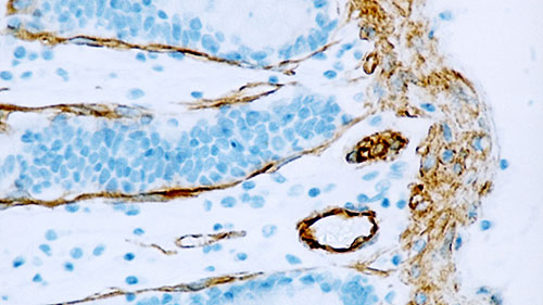 Normal human colon: immunohistochemical staining for Caveolin-1. Note cytoplasmic staining of smooth muscle and endothelium. Caveolin-1: clone 4D6