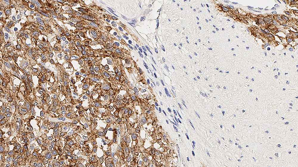 Human colon, gastrointestinal stromal tumor: immunohistochemical staining for DOG-1. Note membrane staining of neoplastic cells. DOG-1: clone K9