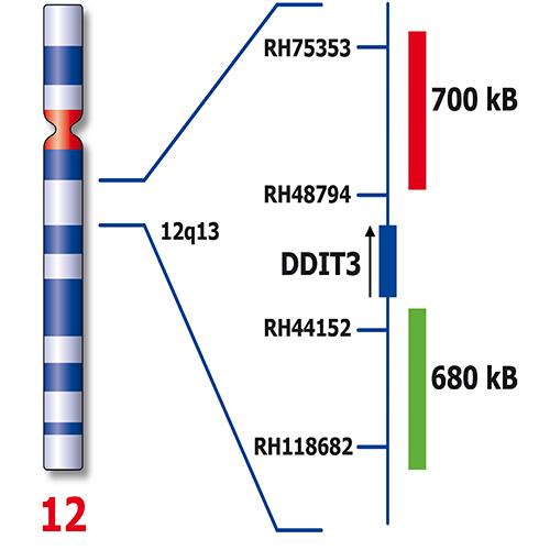 Liposarcoma is one of the most frequent sarcomas in adults, representing 10 to 16 percent of soft tissue sarcomas. Most patients with round cell/myxoid liposarcoma have an acquired t(12;16)(DDIT3-FUS) or t(12;22)(DDIT3-EWS) translocation, both of which involve the DDIT3 gene at 12q13. A break or split probe for DDIT3 is best used to analyze translocation of the DDIT3 (12q13) gene on formalin fixed paraffin embedded tissue for routine clinical diagnosis. The DDIT3 (12q13) Break probe is optimized to detect translocations involving the DDIT3 gene region at 12q13 in a dual-color, break assay.