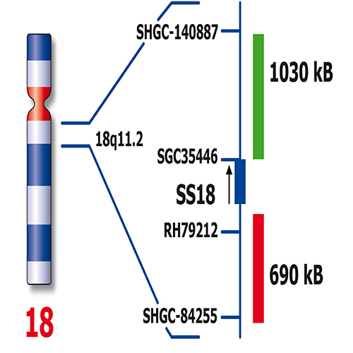 The characteristic chromosomal abnormality in Synovial Sarcoma t(X;18)(p11.2;q11.2) is present in 90% of the patients. This translocation results in the fusion of the synovial sarcoma translocation, chromosome 18 (SS18) gene to either of two distinct genes, SSX1 or SSX2, located on the X chromosome. The SS18 (18q11) Break probe is optimized to detect translocations involving the SS18 gene region at 18q11 in a dual-color, split assay on paraffin embedded tissue sections.