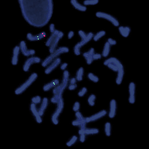 7q- (7q22; 7q36) hybridized to patient material showing a 7q36 deletion (1R2G). Image kindly provided by Prof. Jauch, Heidelberg.