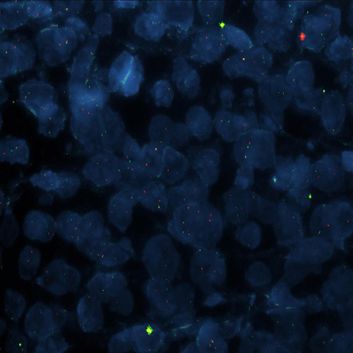 Hybridization of ALK break probe to a lung adenocarcinoma tissue section showing positive translocation signal (1RG1R1G).