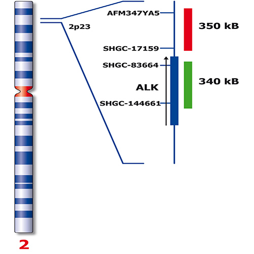 Translocations of the ALK (anaplastic lymphoma kinase) gene at 2p23 have originally been associated with anaplastic lymphomas, B-cell lymphomas, neuroblastomas and myofibroblastic tumors. At least 21 translocation partners have been described, however 80% of the translocations involves the NPM1 gene (5q35). ALK rearrangements have been described in non-small cell lung cancer (NSCLC) cases. Multiple tyrosine kinsae inhibitors (TKI's) specific for ALK have since been approved for first line treatment of NSCLC-patients carrying the fusion gene ALK-EML4. These ALK inhibitors include crizotinib (Xalkori), alectinib (Alecensa) and ceritinib (Zykadia). The ALK (2p23) Break probe is optimized to detect translocations involving the ALK gene region at 2p23.