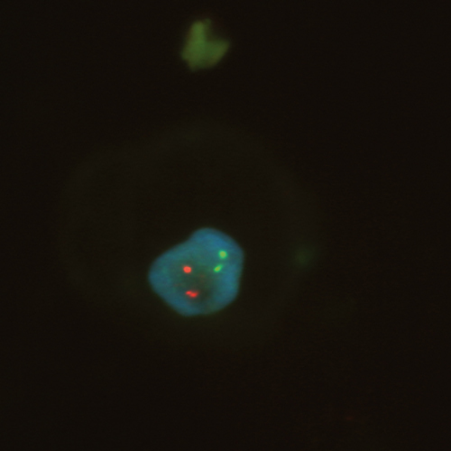 RB1 (13q14)/RCAN1 (21q22) probe hybridized to a normal interphase (2R2G).