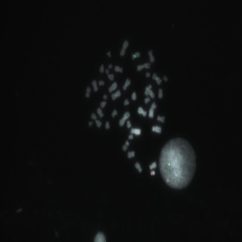 Hybridization of SE X / SE Y probe to a male metaphase spread showing normal pattern (1R1G).