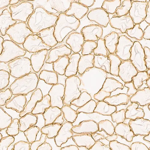 Transverse section of skeletal muscle fibers. Immunohistochemical staining for Alpha Sarcoglycan. Note the demonstration of localized Alpha Sarcoglycan to the sarcolemma of the muscle fibers. Alpha Sarcoglycan: clone Ad1/20A6