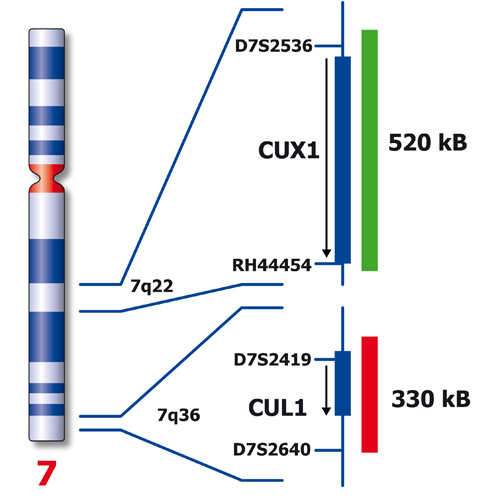Loss of a whole chromosome 7 or a deletion of the long arm, del(7q), are recurring abnormalities in malignant myeloid diseases. Most deletions are interstitial and there are two distinct deleted segments of 7q. The majority of patients have proximal breakpoints in bands q11-22 and distal breakpoints in q31-36. The CCAAT displacement protein CUX1 gene region is located in the 7q22 critical region. The 7q- specific FISH probe is optimized to detect copy number of 7q at 7q22 and at 7q36 simultaneously in a dual-color assay.