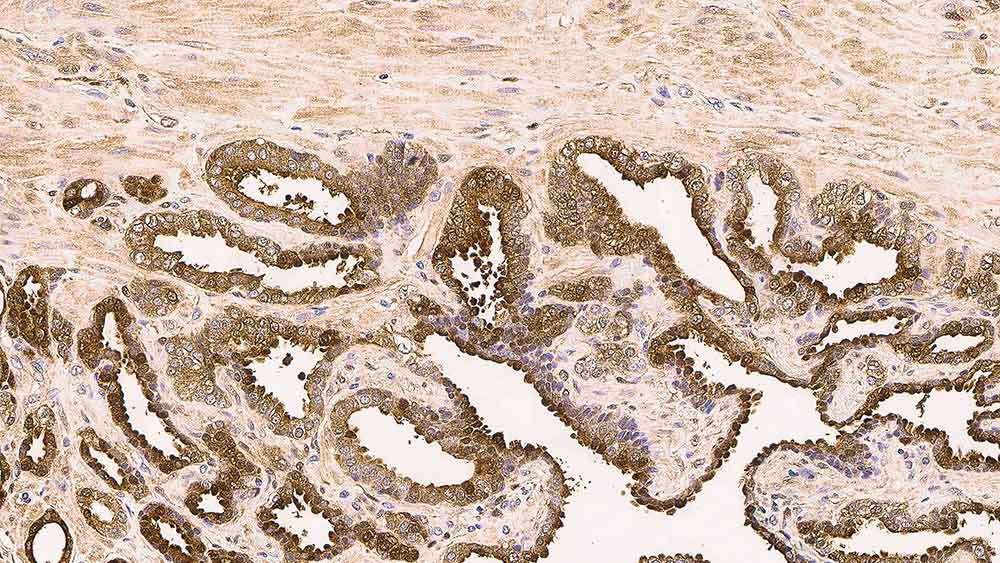 Prostate carcinoma: immunohistochemical staining of Galectin-3. Note the staining in the neoplastic cells and some staining in the stroma. Galectin-3: clone 9C4