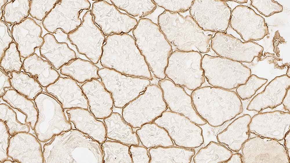 Human striated muscle: immunohistochemical staining for Spectrin. Note membrane staining of muscle fibers. Spectrin: clone RBC2/3D5