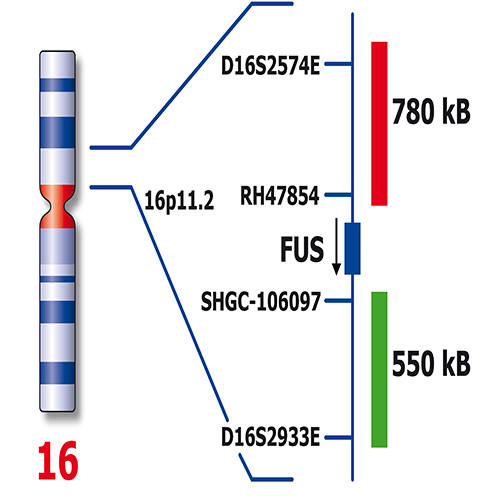 The fused in sarcoma (FUS) gene was originally shown to be rearranged in myxoid liposarcomas harboring a t(12;16)(q13;p11) translocation. FUS has also been shown to be involved in other recombinations: with ERG in acute myeloid leukemia carrying a t(16;21), with ATF1 in band 12q13 in angiomatoid fibrous histiocytoma, and with CREB3L2 in fibromyxoid sarcoma. A break or split probe for FUS is best used to analyze translocation of the FUS (16p11) gene on formalin fixed paraffin embedded tissue for routine clinical diagnosis. The FUS (16p11) Break probe is optimized to detect translocations involving the FUS gene region at 16p11 in a dual-color, split assay on metaphase/interphase spreads and paraffin embedded tissue sections.