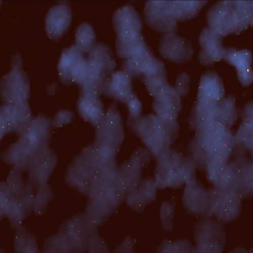 Translocations involving the ROS1 gene at chromosome 6q22 can increase expression of the gene by fusion with SLC34A2 (4p15), but also with other fusion partners. Elevated expression is observed in non-small cell lung cancer (NSCLC), where the success of tyrosine kinase-based therapeutics like Crizotinib (Xalkori) is based on inhibiting the activity of these fusion genes. The fusion of ROS1 to the GOPC (FIG) gene, by deletion of a 240 kb DNA fragment, also results in activation of a fusion gene. The ROS1 (6q22) Break probe is optimized to detect translocations involving the ROS1 gene region at the 6q22 locus, as well as the 240 kb deletion forming the ROS1-GOPC fusion gene, in a dual-color assay on formalin- fixed paraffin-embedded tissue samples.