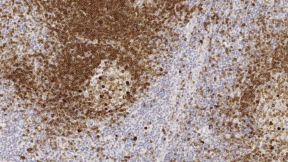 Human tonsil: immunohistochemical staining for CD79b. Note intense membrane staining of B cells. CD79b: clone JS01