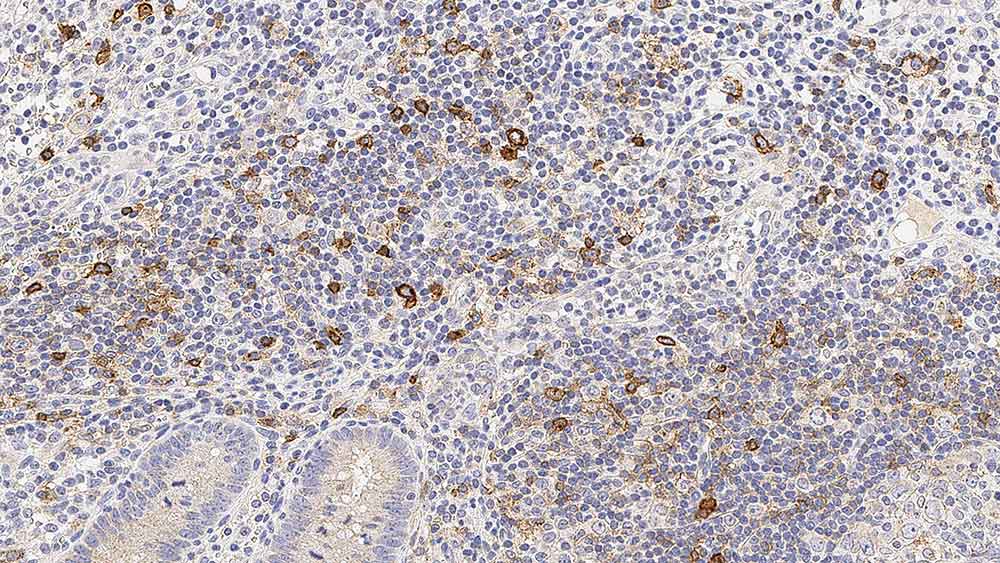 Human appendix: immunohistochemical staining for CD25. Note staining of activated lymphocytes. CD25: clone 4C9