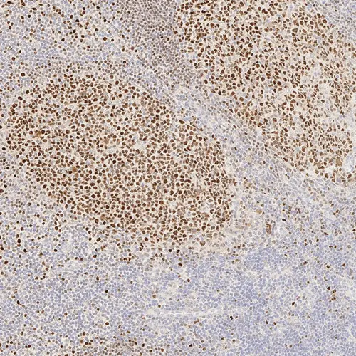 Oct-2 is a transcription factor belonging to the POU homeo domain family that binds to the Ig gene octamer sites regulating B-cell-specific genes. It is dependent on the activity of B cell restricted coactivators such as BOB.1/OBF.1. Oct-2 protein expression is not restricted to B cells, although expression levels are much higher in these cells. Reports indicate that germinal center B cells show higher expression for Oct-2 and BOB.1/OBF.1. In addition, Oct-2 expression is reported to be significantly greater in germinal center derived lymphomas, although other B cell lymphomas also display high levels of expression. Reed-Sternberg (RS) cells represent the malignant cells in classical Hodgkin's disease and are derived from germinal center B cells. In a number of these cases, cells do not express immunoglobulin due to the presence of crippling mutations within the Ig genes. As Ig gene expression in B cells also requires an interaction between octamer sites and the transactivating factors Oct-2 and BOB.1, the absence of both Oct-2 and BOB.1 expression represents a novel mechanism for immunoglobulin gene deregulation in RS cells.