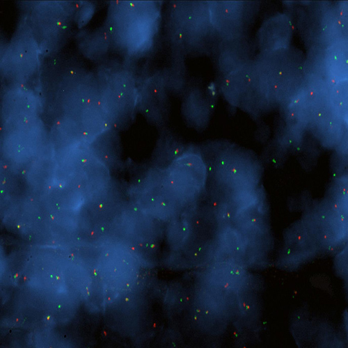 Hybridization of BCL6 break probe to a tissue section showing aberrant pattern (1RG1R1G).