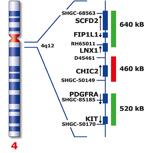 The deletion of the CHIC2 locus generates a fusion FIP1L1-PDGFRA gene giving rise to a novel tyrosine kinase. This deletion has been observed in patients with idiopathic hypereosinophilic syndrome (HES), chronic eosinophilic leukemia (CEL), systemic mast cell disease, and chronic myeloproiferative disorders (CMPD). The FIP1L1 / CHIC2 / PDGFRA FISH probe is optimized to detect the CHIC2 deletion at 4q12 associated with the FIP1L1 / PDGFRA fusion in a Dual-Color, split assay. It also allows the detection of translocation involving the FIP1L1 and PDGFRA region. However, chromosome 4 polyploidy may provide additional signals not associated with a translocation involving 4q12.