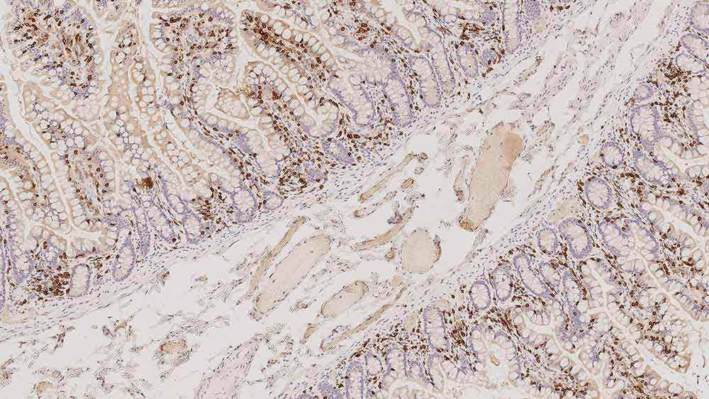 Human normal small bowel immunohistochemistry staining of CD103. Note membrane and cytoplasmic staining of Intraepithelial T lymphocytes. CD103: clone EP206