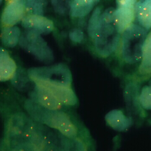 FUS (16p11) Break probe hybridized to liposarcoma material.