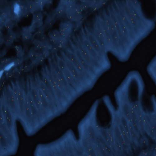 Hybridization of IGH break probe to a tissue section showing normal and aberrant pattern (2RG)(1RG1R1G)
