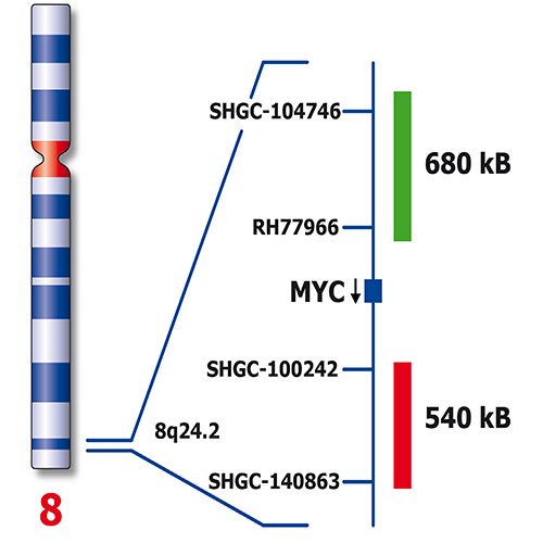 MYC (8q24) Break - XL for BOND FISH probe detects genomic translocations involving the MYC gene. MYC (8q24) Proximal - XL and MYC (8q24) Distal - XL are optimized to detect the genomic regions proximal and distal to break points in the MYC gene region. When combined, both probes are used to detect translocations involving the MYC gene at 8q24.