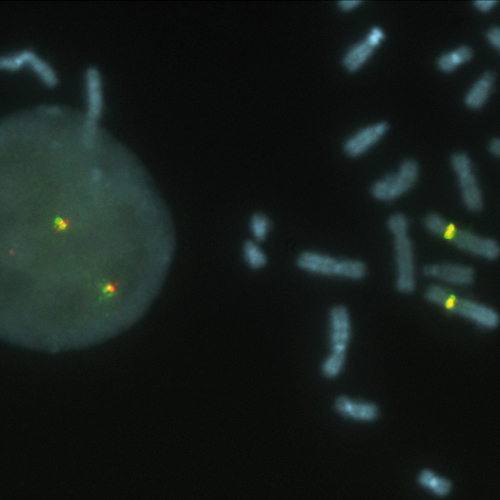 The deletion of the CHIC2 locus generates a fusion FIP1L1-PDGFRA gene giving rise to a novel tyrosine kinase. This deletion has been observed in patients with idiopathic hypereosinophilic syndrome (HES), chronic eosinophilic leukemia (CEL), systemic mast cell disease, and chronic myeloproiferative disorders (CMPD). The FIP1L1 / CHIC2 / PDGFRA FISH probe is optimized to detect the CHIC2 deletion at 4q12 associated with the FIP1L1 / PDGFRA fusion in a Dual-Color, split assay. It also allows the detection of translocation involving the FIP1L1 and PDGFRA region. However, chromosome 4 polyploidy may provide additional signals not associated with a translocation involving 4q12.