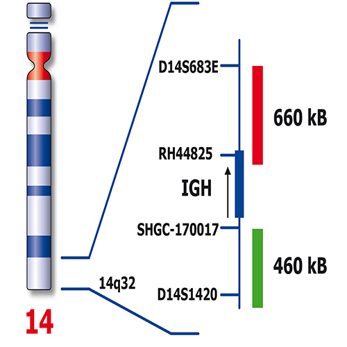 Multiple myeloma is characterized by complex rearrangements involving the IgH gene, particularly at the constant locus. The IgH rearrangement provides a useful marker of clonality in B-cell malignancies and amplification of this rearrangement is the method of choice to monitor the residual tumor cells in multiple myeloma. The IGH (14q32) break probe is optimized to detect translocations involving the IGH gene region at 14q32 in a dual-color, split assay.