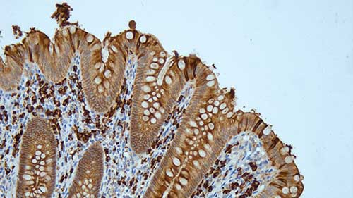Human appendix: immunohistochemical staining for Immunoglobulin A. Note the intense staining of plasma cells and secreted Immunoglobulin A: clone N1CLA