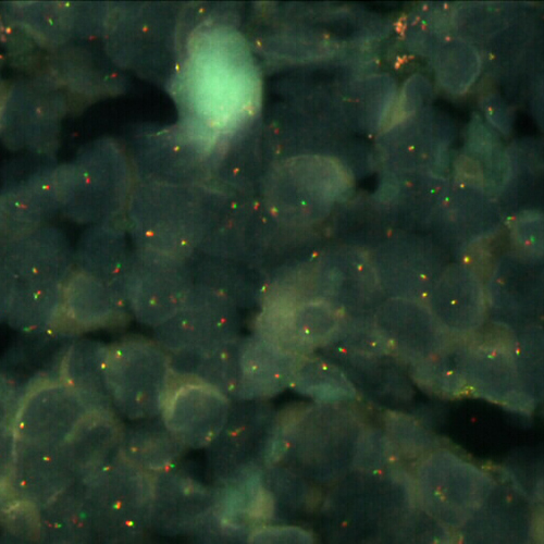 FOXO1 (13q14) Break probe hybridized to patient material (2RG).