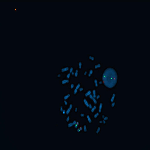 Hemizygous deletions and rearrangements of chromosome 9, band p21 are among the most frequent cytogenetic abnormalities detected in pediatric acute lymphoblastic leukemia (ALL). This deletion includes loss of the CDKN2A (previously known as p16, INK4A or MTS1) / CDKN2B (previously known as p15, INK4B or MTS2) genes, which are cell cycle kinase inhibitors and important in leukemogenesis. The CDKN2A (9p21) specific FISH probe is optimized to detect copy numbers of the CDKN2A gene region at region 9p21. The 9q21 region probe is included to facilitate chromosome identification.
