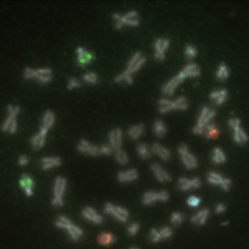 PML / RARA t(15;17) Fusion probe hybridized to a normal metaphase (2R2G).