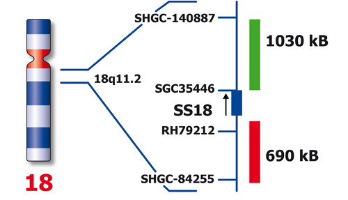 The SS18 (18q11) Break - XL for BOND FISH probe detects genomic translocations involving the SS18 gene. SS18 (18q11) Proximal - XL and SS18 (18q11) Distal - XL are optimized to detect genomic regions proximal and distal to break points in the SS18 gene region.